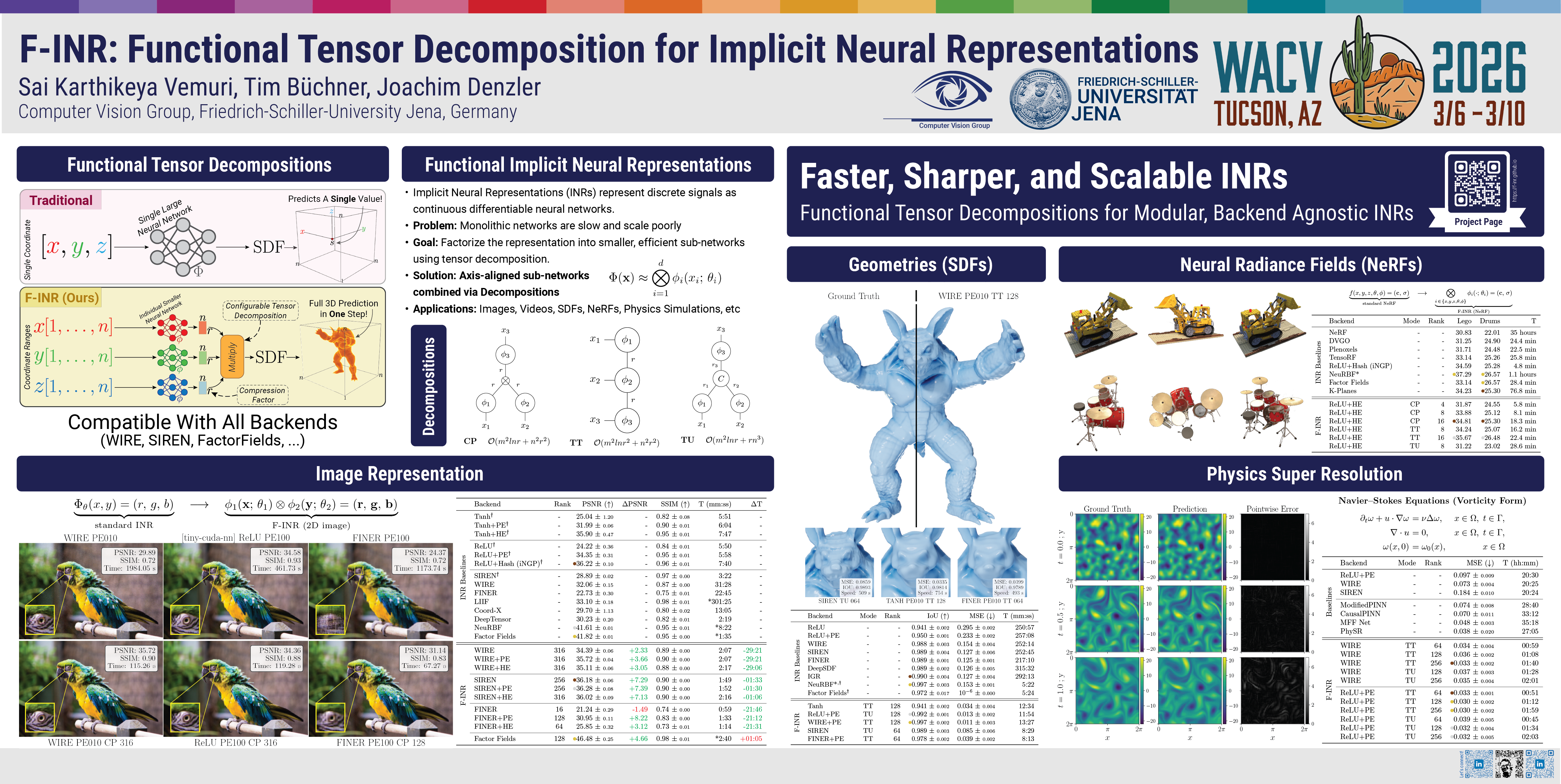 We propose F-INR, a framework that addresses this limitation by factorizing a high-dimensional INR into a set of compact, axis-specific sub-networks based on functional tensor decomposition.
